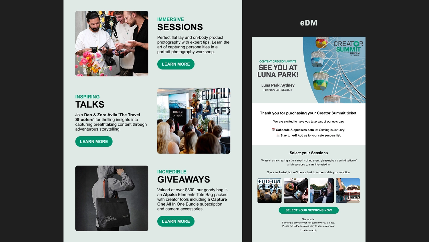 Using the existing campaign lockup as a base, we built a dynamic visual narrative that brought the event to life, highlighting speakers, workshops, and hands-on moments. Every asset was crafted to echo Fujifilm’s core values: simplicity, beauty, and the joy of capturing moments.