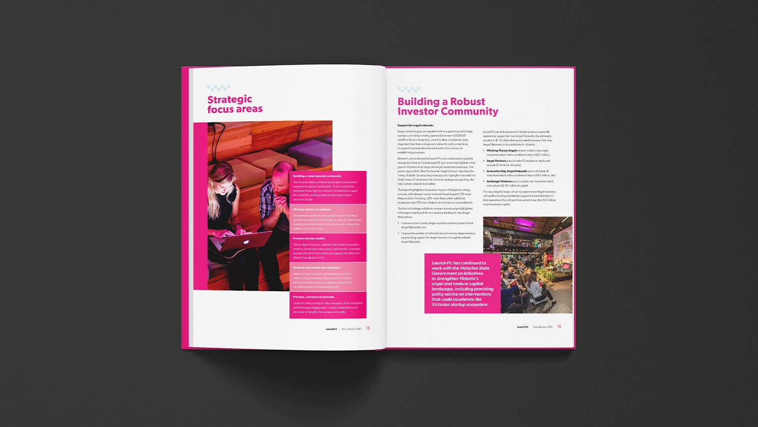 The 2020 Victorian Startup Ecosystem Mapping Report analysed almost 1,900 local startups across sector, geography, demographics, and funding. The challenge was to present this data-rich content in a way that was both visually engaging and aligned with LaunchVic’s energetic and modern brand identity.